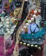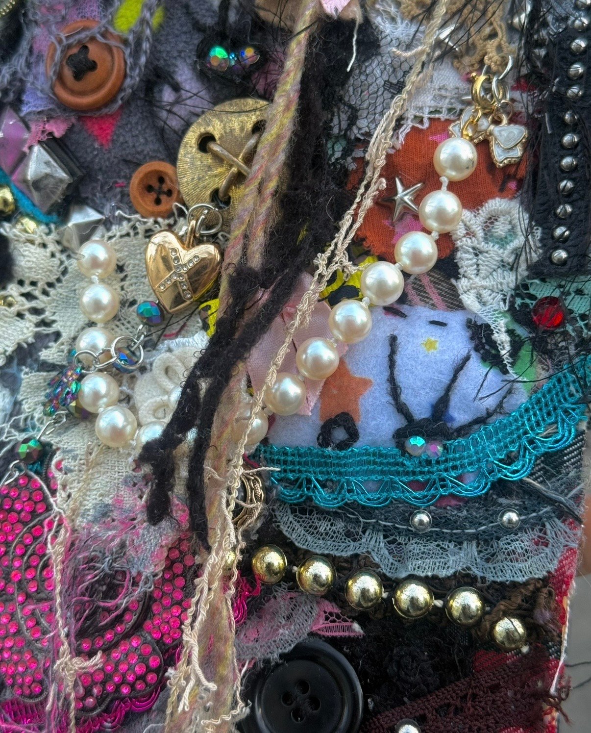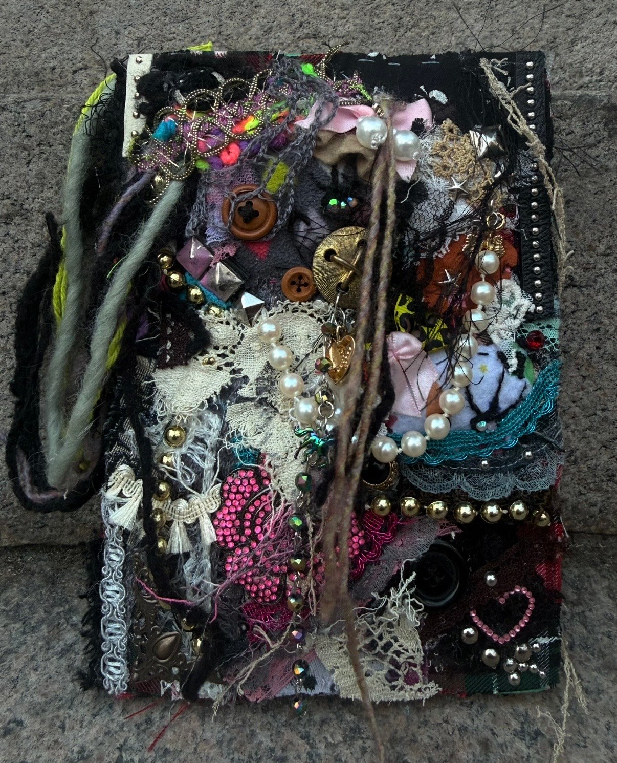The diary cover is built through layered textiles, lace, beads and so much more precious found materials I've collected — including metal bits and bobs, buttons, and hand-stitched moments such as Lavender stuffed teddy bears ʕ´•ﻌ•`ʔ
